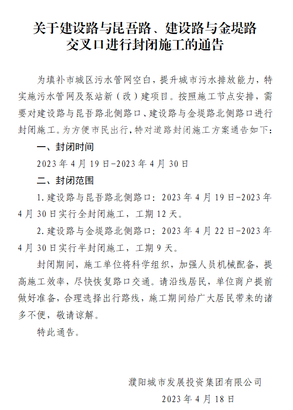 關于建設路與昆吾路、建設路與金堤路交叉口進行封閉施工的通告