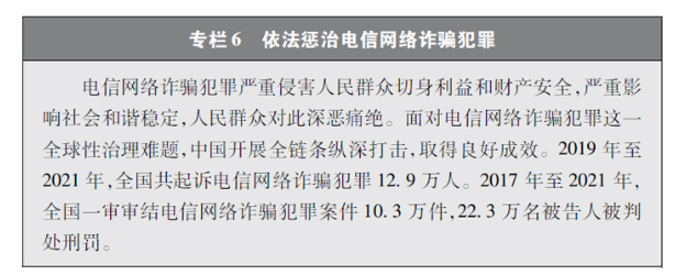 加大網(wǎng)絡(luò)犯罪懲治力度。隨著互聯(lián)網(wǎng)技術(shù)的快速發(fā)展,傳統(tǒng)犯罪加速向以互聯(lián)網(wǎng)為媒介的非接觸式犯罪轉(zhuǎn)變,電信網(wǎng)絡(luò)詐騙、網(wǎng)絡(luò)賭博、網(wǎng)絡(luò)淫穢色情等涉網(wǎng)違法犯罪多發(fā)。中國(guó)依法辦理新型網(wǎng)絡(luò)犯罪案件。連續(xù)多年開(kāi)展“凈網(wǎng)行動(dòng)”,嚴(yán)厲打擊群眾反映強(qiáng)烈的黑客攻擊破壞、侵犯公民個(gè)人信息等違法犯罪活動(dòng)。持續(xù)推進(jìn)“云劍”“斷卡”“斷流”“拔釘”等專項(xiàng)行動(dòng),打擊套路貸、校園貸、“以房養(yǎng)老”、“投資養(yǎng)老”等電信網(wǎng)絡(luò)詐騙犯罪,依法懲處為電信網(wǎng)絡(luò)詐騙犯罪團(tuán)伙提供互聯(lián)網(wǎng)接入、域名注冊(cè)、服務(wù)器托管、移動(dòng)互聯(lián)網(wǎng)應(yīng)用程序制作開(kāi)發(fā)、網(wǎng)絡(luò)支付、引流推廣等服務(wù)支撐的黑灰產(chǎn)業(yè)。完善國(guó)家反詐大數(shù)據(jù)平臺(tái)和反詐移動(dòng)互聯(lián)網(wǎng)應(yīng)用程序,建設(shè)國(guó)家涉詐黑樣本庫(kù),完善快速止付凍結(jié)機(jī)制、涉詐資金返還機(jī)制。堅(jiān)決打擊網(wǎng)絡(luò)賭博犯罪行為,從嚴(yán)治理網(wǎng)絡(luò)淫穢色情。網(wǎng)絡(luò)犯罪治理工作取得明顯成效,人民群眾安全感有效提升,社會(huì)更加和諧穩(wěn)定。