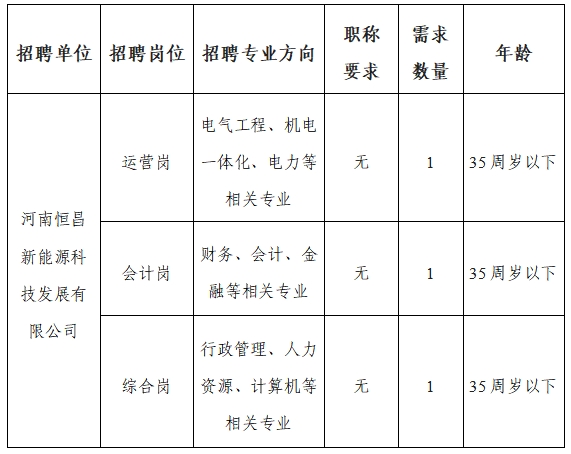 緩解河南恒昌新能源科技發(fā)展有限公司人才短缺狀況,結(jié)合公司經(jīng)營(yíng)實(shí)際,現(xiàn)面向社會(huì)公開(kāi)招聘專業(yè)人才3名。現(xiàn)將有關(guān)事項(xiàng)公告如下: